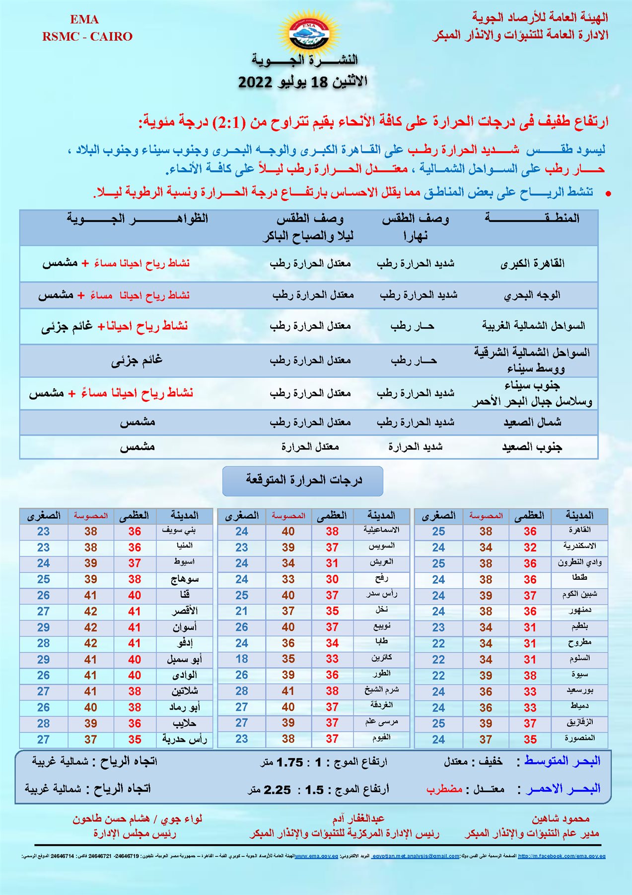 وحرصًا من القاهرة 24 على تقديم آخر أخبار الطقس والأرصاد للمواطنين الأحباء، سوف نقدم لكم تفاصيل حالة الطقس ودرجات الحرارة غدا الإثنين الموافق 18 يوليو 2022 في البلاد.