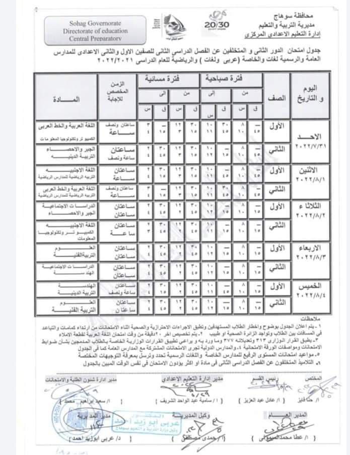 ننشر جدول امتحانات الدور الثاني للصفين الأول والثاني الإعدادي بسوهاج | مستند
