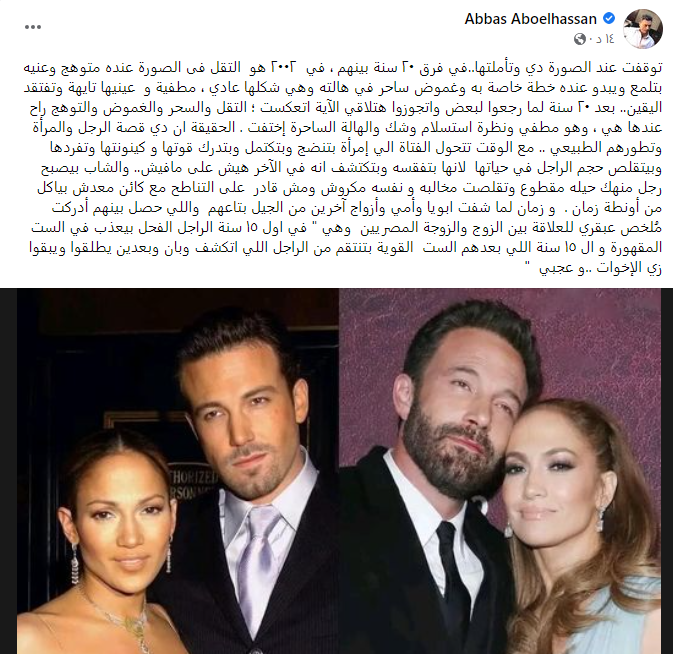 علق الفنان عباس أبو الحسن، على زواج جينفر لوبيز وبن أفلليك بعد قصة حب دامت لـ 20 عامًا، إذ أشار إلى أن الرجل عندما يتزوج ينطفئ، ويصبح منهكا، عكس الفتاة التي تتحول إلى امرأة قوية وناضجة.