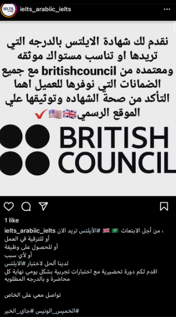 تداولت مجموعة من الصفحات عبر مواقع التواصل الاجتماعي، منشورات للترويج لبيع شهادات الاختبار الدولي للغة الإنجليزية (الآيلتس)، زاعمة إعطاء الشهادات دون حضور الاختبارات مقابل جمع مبالغ مالية من الطلاب.