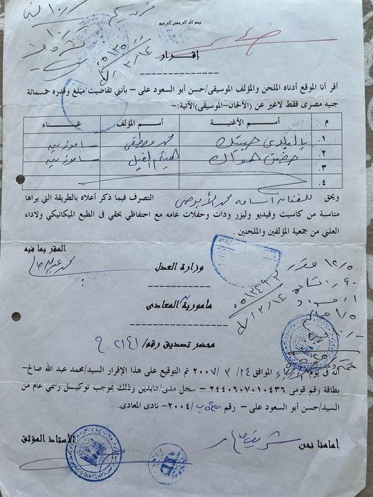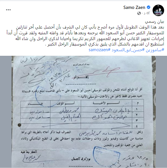 وكتب سامو زين بيانًا رسميًا، عبر حسابه الشخصي بموقع التواصل الاجتماعي فيسبوك، قال فيه: بيان رسمي.. بعد هذا الوقت الطويل، لأول مرة أصرح بأني كان لي الشرف، أن أحصل على آخر تنازلين للموسيقار الكبير حسن أبو السعود الله يرحمه، وبعدها بأيام قد وافته المنية.