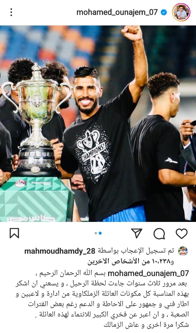 وكتب محمد أوناجم رسالة وداعية إلى جماهير الزمالك عقب نهاية مشواره مع القلعة البيضاء، عبر حسابه على موقع التواصل الاجتماعي انستجرام.