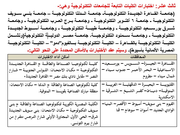 13. الكليات التابعة للجامعات التكنولوجية بكل من (جامعة القاهرة الجديدة التكنولوجية- جامعة الدلتا التكنولوجية – جامعة بني سويف التكنولوجية - جامعة 6 أكتوبر التكنولوجية - جامعة برج العرب التكنولوجية - جامعة شرق بورسعيد التكنولوجية - جامعة طيبة التكنولوجية - جامعة أسيوط الجديدة التكنولوجية - جامعة سمنود التكنولوجية - جامعة مصر الدولية التكنولوجية (وتشمل الكلية التكنولوجية بالقاهرة – الكلية التكنولوجية بالفيوم) – الكلية التكنولوجية المصرية الألمانية بأسيوط).