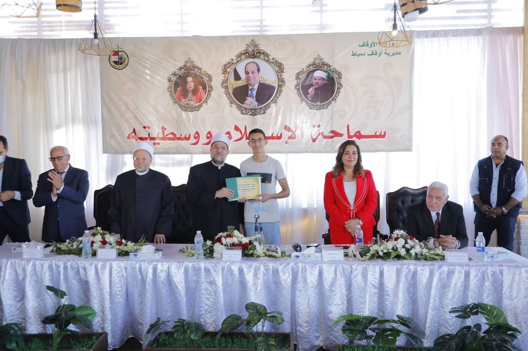 ومن جانبه، وجه الدكتور محمد مختار جمعة التحية لمحافظة دمياط، مشيدا بجهودها المبذولة لدفع عجلة التنمية على أرض المحافظة بكافة المجالات، ورعايتها الدائمة لكافة المبادرات التي تطلقها الوزارة، كما أثنى على الجهود المبذولة مع الجانب الكويتي لإنشاء أول دار مناسبات بالمحافظة، واستعرض الوزير ما تم تحقيقه من جهود خلال الفترة الماضية لإحلال وتجديد وصيانة المساجد وإطلاق عدة مشروعات منها حق الطفل والأسبوع الثقافي وصكوك الإطعام والأضاحي، مشيرا إلى الدور الذى تقوم به أكاديمية الأوقاف لتنفيذ دورات تدريبية للعلماء بالدول الشقيقة، وأضاف وزير الأوقاف أن رعاية محافظ دمياط وحضور مفتى الجمهورية ومحافظ بورسعيد فعاليات اليوم يعكس التكامل بين مؤسسات الدولة المختلفة.
