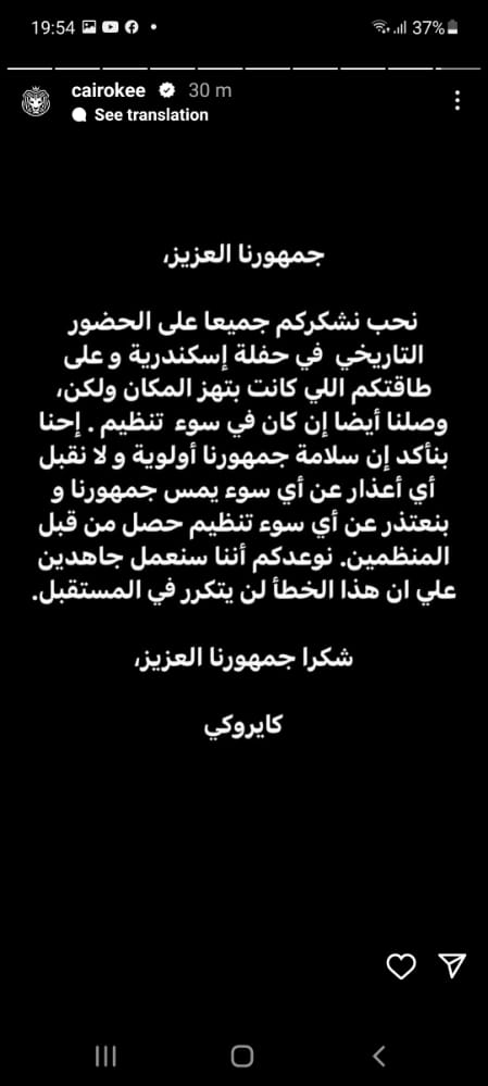 قدمت فرقة كايروكي اعتذارًا للجمهور، بعدما تلقوا العديد من الشكاوى، بشأن تنظيم حفلهم بالأمس، في سيدي جابر بمحافظة الإسكندرية.