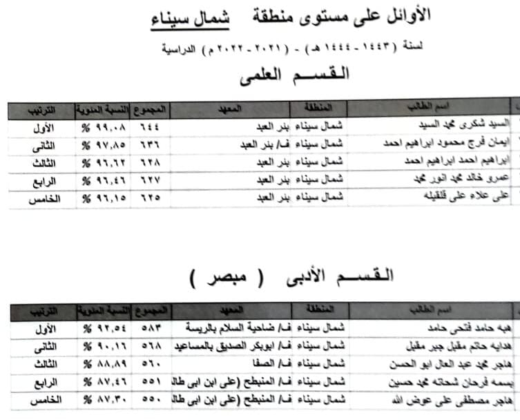 أعلنت المنطقة الأزهرية بمحافظة شمال سيناء أسماء أوائل الثانوية الأزهرية على مستوى المحافظة للقسم العلمي والأدبي.