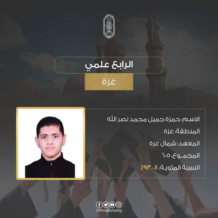 الطالب حمزة جميل محمد نصر الله، منطقة غزة الأزهرية (معهد غزة) على المركز الرابع بمجموع درجات 605 (93.08).