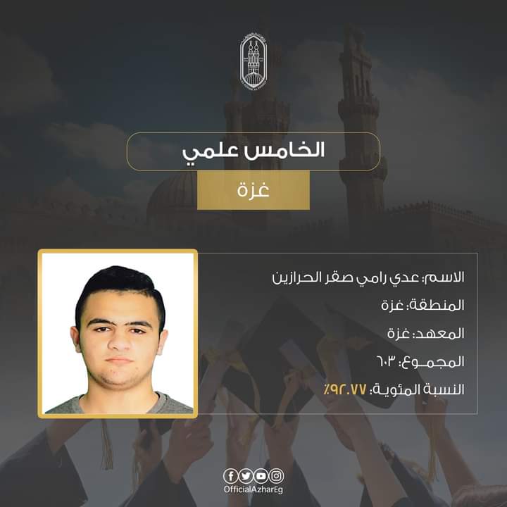الطالب عدي رامي صقر الحرازين، منطقة غزة الأزهرية (معهد غزة) على المركز الخامس بمجموع درجات 603 (92.77).
