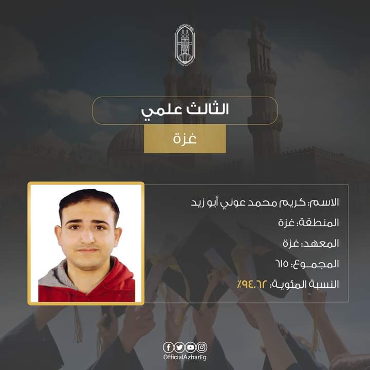الطالب كريم محمد عوني أبوزيد، منطقة غزة الأزهرية (معهد غزة) على المركز الثالث بمجموع درجات 615 (94.62%).