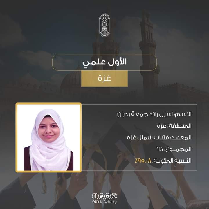 الطالبة أسيل رائد جمعة بدران، منطقة غزة الأزهرية (معهد فتيات غزة) على المركز الأول بمجموع درجات 618 (95.08%).