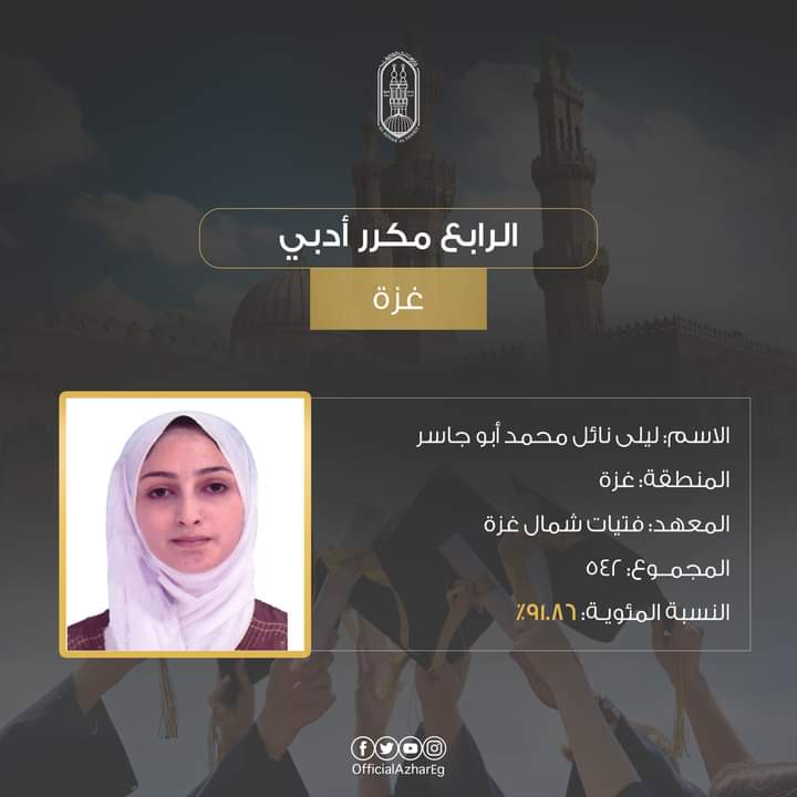 الطالبة ليلى نائل محمد أبو جاسر منطقة غزة الأزهرية (معهد فتيات شمال غزة) على المركز الرابع مكرر بمجموع درجات 542 (91.86).