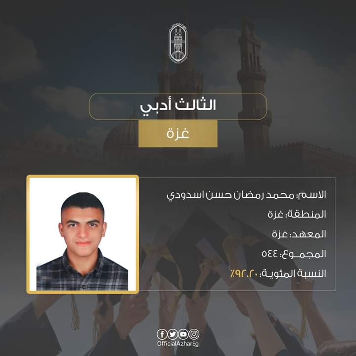 الطالب محمد رمضان حسن أسدودي، منطقة غزة الأزهرية (معهد غزة) على المركز الثالث بمجموع درجات 544 (92.2%).