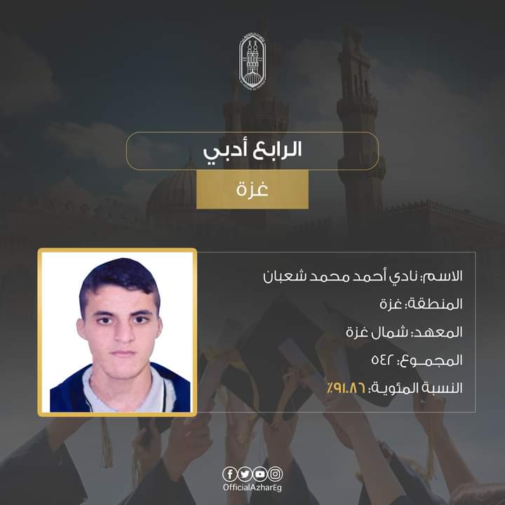 الطالب نادي أحمد محمد شعبان، منطقة غزة الأزهرية (معهد شمال غزة) على المركز الرابع بمجموع درجات 542 (91.86).