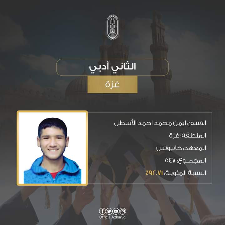 الطالب أيمن محمد أحمد الأسطل، منطقة غزة الأزهرية (معهد خان يونس) على المركز الثاني بمجموع درجات 547 (92.71%).