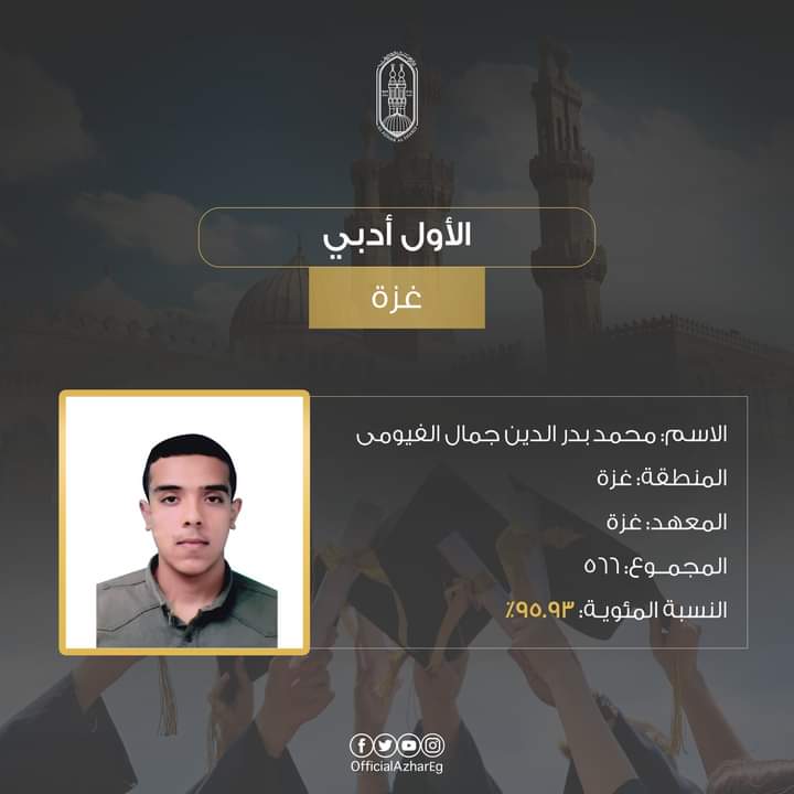 الطالب محمد بدر الدين حمدان الفيومي، منطقة غزة الأزهرية (معهد غزة) على المركز الأول بمجموع درجات 566 (95.93%).