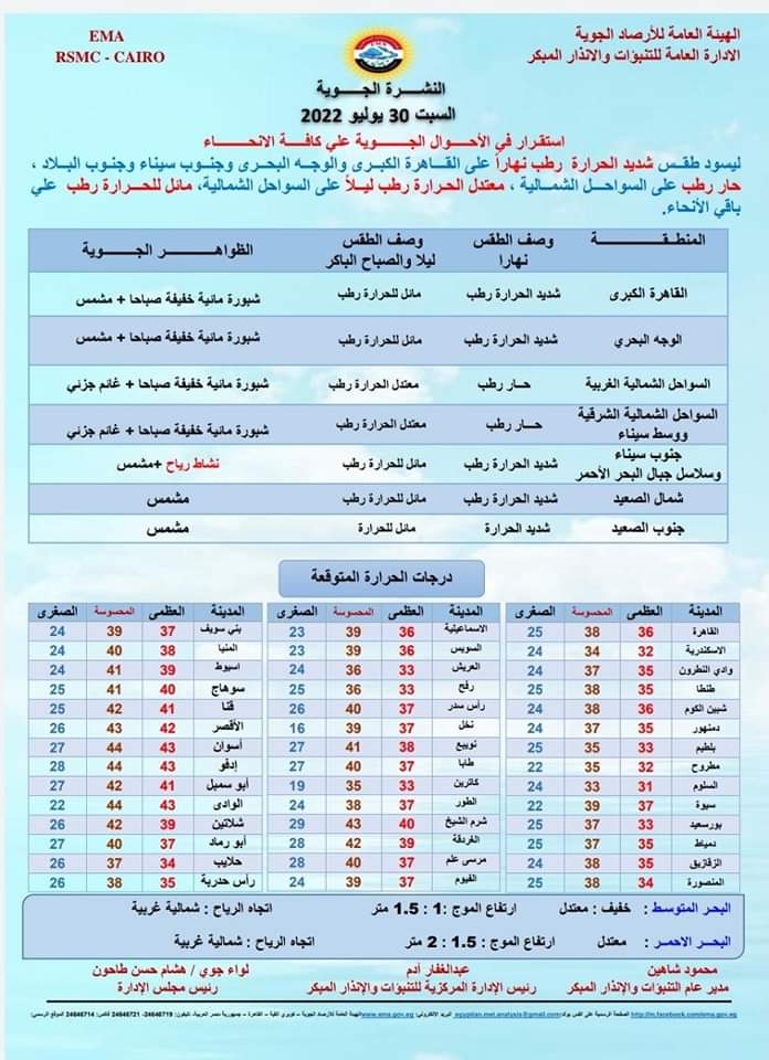 كشفت هيئة الأرصاد الجوية، تفاصيل حالة الطقس اليوم السبت 30 يوليو 2022، حيث يسود طقس شديد الحرارة رطب خلال فترات النهار على القاهرة الكبرى، الوجه البحري، جنوب سيناء وجنوب البلاد.