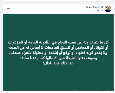 وقال شوقي خلال تصريحات له عبر صفحته على موقع التواصل الاجتماعي فيس بوك: كل ما يتم تداوله عن نسب النجاح في الثانوية العامة أو المؤشرات أو الأوائل أو المجاميع أو تنسيق الجامعات لا أساس له من الصحة ولا يعدو كونه اجتهاد أو توقع أو إشاعة أو محاولة لانفراد صحفي.