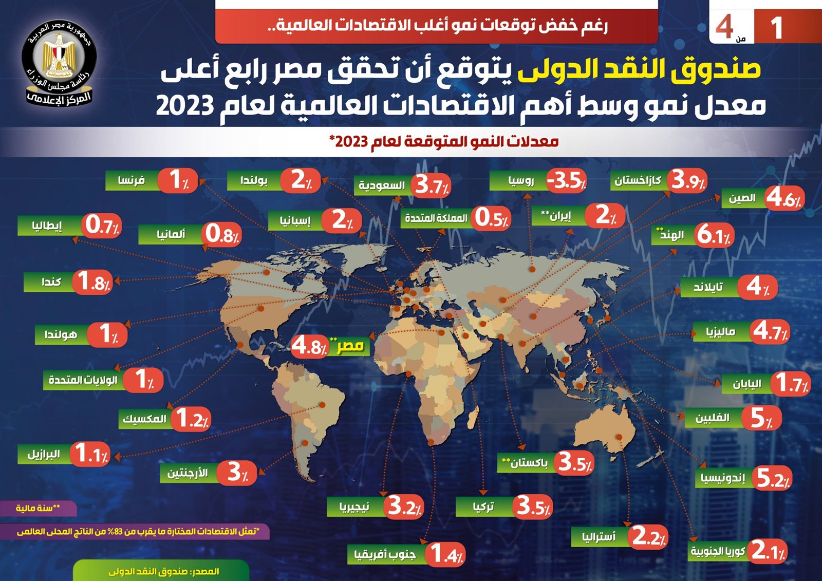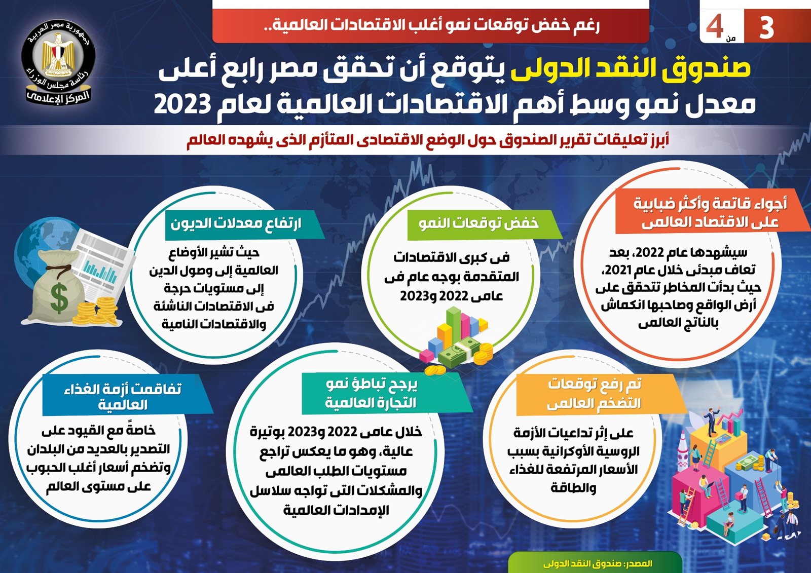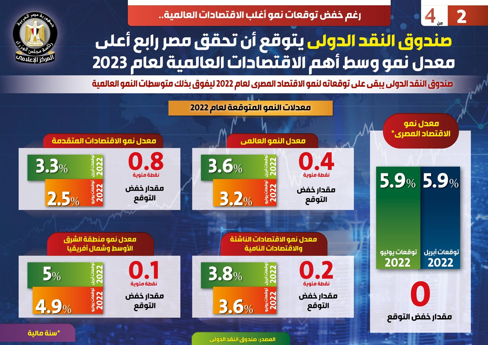 نشر المركز الإعلامي لمجلس الوزراء، تقريرًا تضمن انفوجراف، سلّط الضوء على توقعات صندوق النقد الدولي، بتحقيق مصر رابع أعلى معدل نمو وسط أهم الاقتصادات العالمية لعام 2023، رغم خفض توقعات نمو أغلب الاقتصادات العالمية.