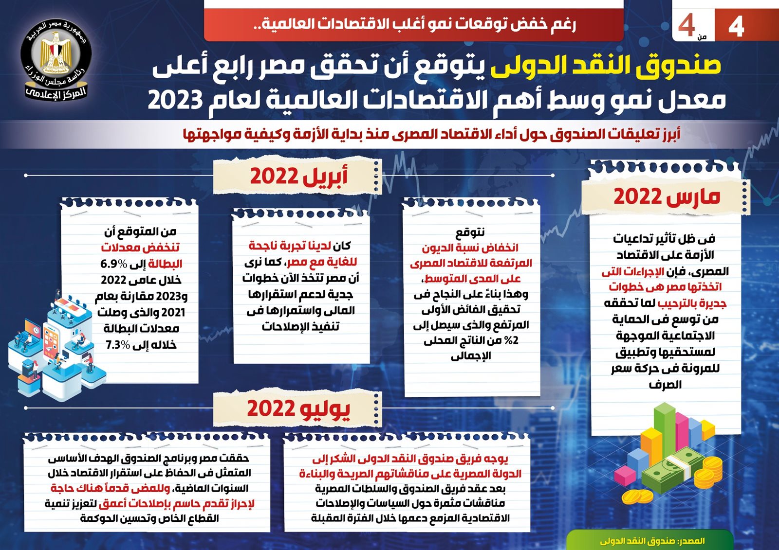 وأكد الصندوق في أبريل 2022، أن لديه تجربة ناجحة للغاية مع مصر، مشددًا على أن مصر تتخذ الآن خطوات جدية لدعم استقرارها المالي واستمرارها في تنفيذ الإصلاحات، كما توقع أن تنخفض معدلات البطالة إلى 6.9% خلال عامي 2022 و2023 مقارنة بعام 2021، والذي وصلت معدلات البطالة خلاله إلى 7.3%.