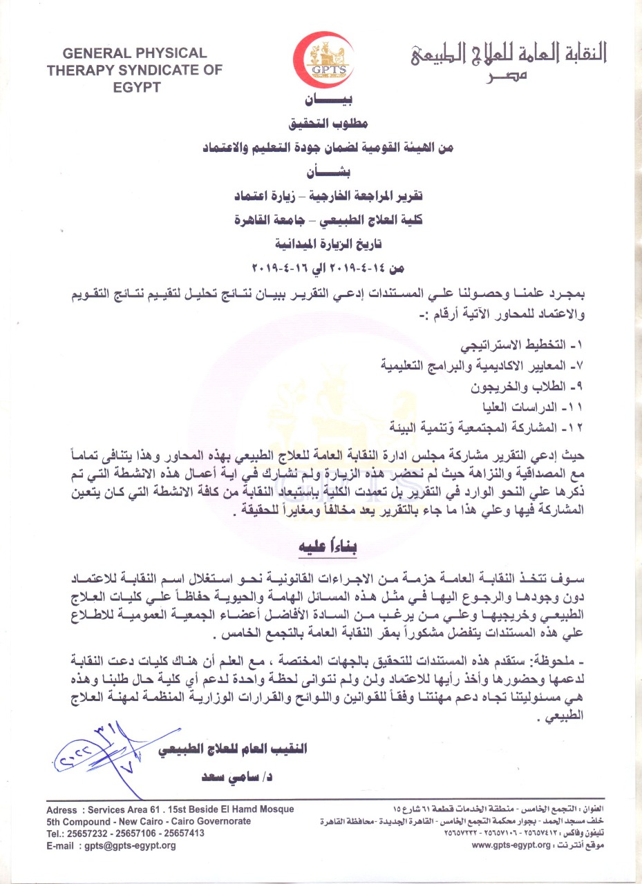 طالبت النقابة العامة للعلاج الطبيعي، التحقيق من قبل الهيئة القومية لضمان جودة التعليم والاعتماد بشأن تقرير المراجعة الخارجية الخاصة بكلية العلاج الطبيعي جامعة القاهرة، بأن النقابة أجرت زيارة ميدانية، ووافقت على عدد من النتائج والمحاور الخاصة بالكلية، وذلك على غير الحقيقة.