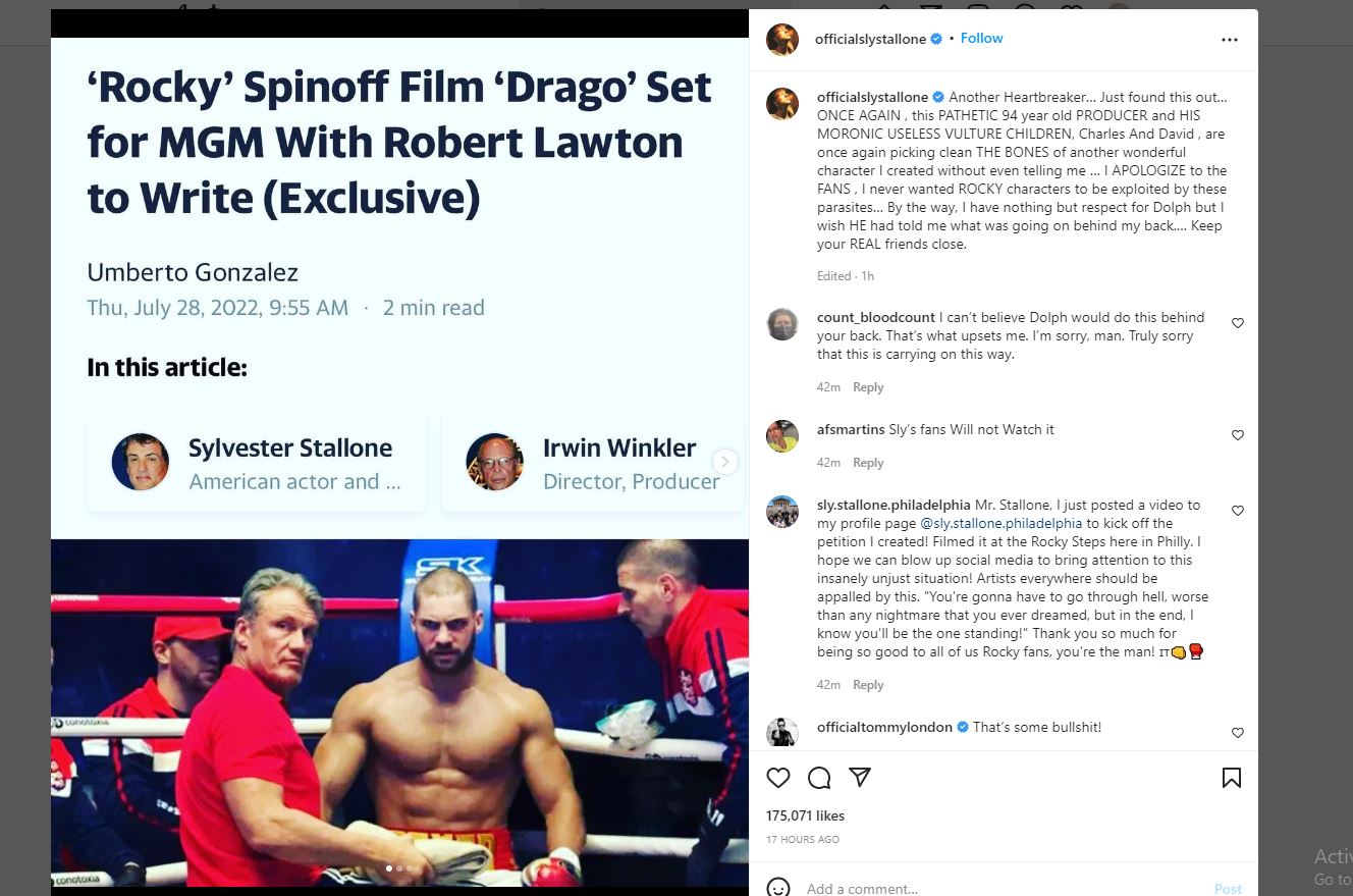 وأكد سيلفستر ستالون أحقية حصوله على حقوق ابتكاره لـ مسلسل روكي قائلًا: بعد سيطرة إيروين وينكلر على سلسلة روكي لأكثر من 47 عامًا، أريد حقًا الحصول على ما تبقى من حقوقي على الأقل، أعتقد أن هذا سيكون لفتة عادلة من مثير للشفقة ومغرور، ويبلغ من العمر 93 عامًا، وذلك خلال حسابه الشخصي انستجرام.