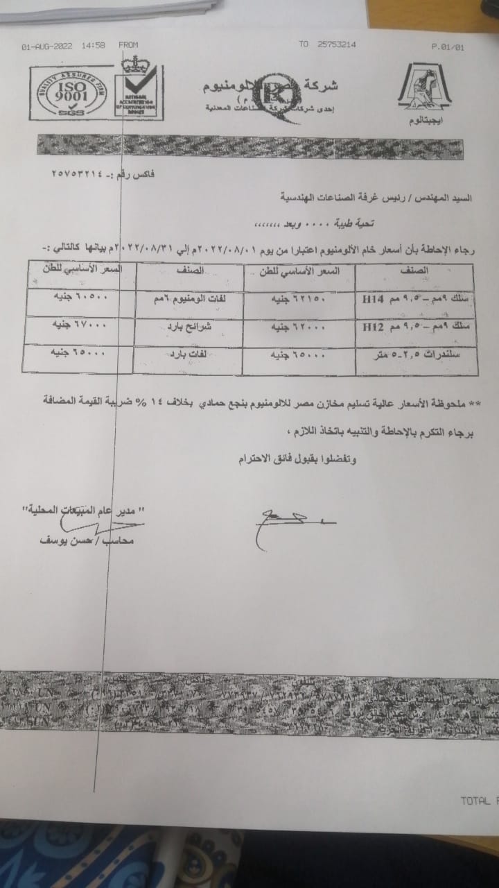 وتراجعت أسعار لفائف الألمونيوم 6 مم بنحو 8000 جنيه لتبلغ 60.5 ألف جنيه خلال أغسطس الجاري في مقابل 68.5 ألف جنيه خلال يوليو.