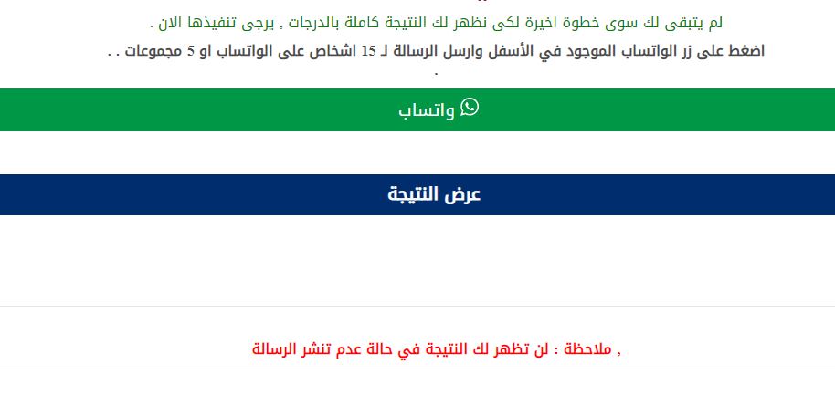 وبعد أن سجلنا كافة البيانات ظهرت رسالة تدعو لمشاركة الرابط عبر الواتس آب وإرسال الرابط للآخرين، كأحد طرق الاحتيال لدخول الرابط بدون ظهور أي نتائج، حيث اشترط الموقع على الطلاب ضرورة مشاركة التسجيل، قائلًا: اضغط على زر الواتساب الموجود في الأسفل وأرسل الرسالة لـ 15 شخصا على الواتساب أو 5 مجموعات، ولن تظهر لك النتيجة في حالة عدم نشر الرسالة.