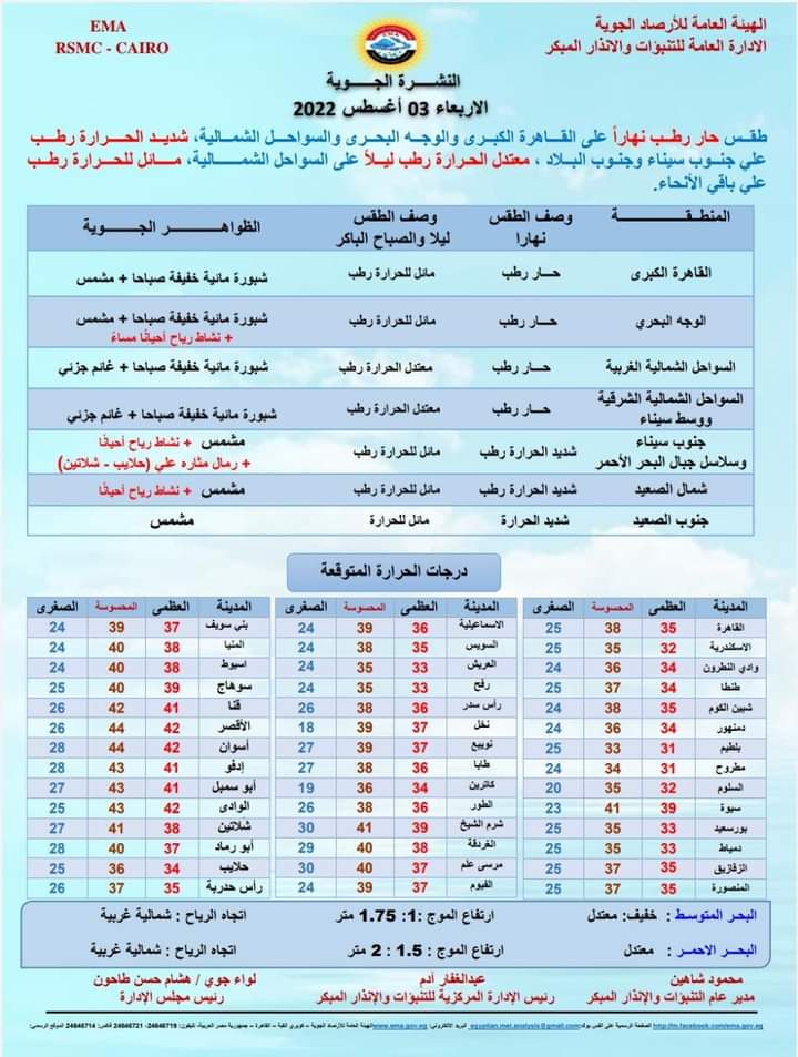 نشرت الهيئة العامة للأرصاد الجوية، بيانًا جديدًا يكشف تفاصيل حالة الطقس غدًا الأربعاء، الموافق 3 أغسطس 2022، موضحة أبرز الظواهر الجوية التي تتعرض لها البلاد خلال الأسبوع المقبل.