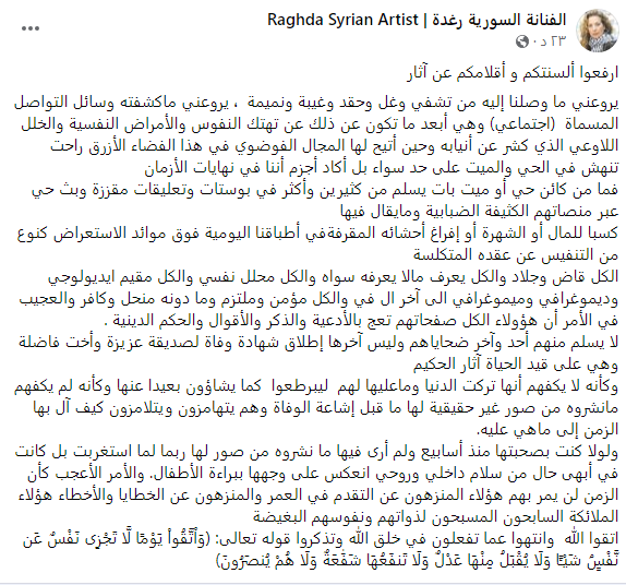 وأضافت الفنانة رغدة: كسبًا للمال أو الشهرة، أو إفراغ أحشائه المقرفة في أطباقنا اليومية، فوق موائد الاستعراض كنوع من التنفيس عن عقدة المتكلسة، الكل قاض وجلاد، والكل يعرف مالا يعرفه سواه، والكل محلل نفسي، والكل مقيم ايديولوجي، وديموغرافي وميموغرافي إلى آخر الـ في، والكل مؤمن وملتزم وما دونه منحل وكاف، والعجيب في الأمر أن هؤلاء الكل صفحاتهم تعج بالأدعية والذكر والأقوال والحكم الدينية.