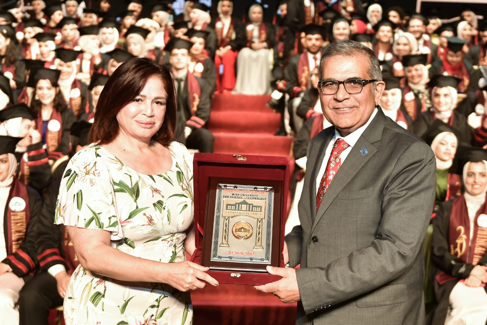 وعلى هامش حفل التخرج، كرم الدكتور أشرف حيدر القائم بأعمال رئيس جامعة مصر للعلوم والتكنولوجيا ضيف الحفل الفنانة الكبيرة إلهام شاهين، وقدم لها درع الجامعة، وأكدت الفنانة أنها سعيدة بمشاركة الطلاب في حفلهم متمنية لهم دوام التوفيق والانطلاق بكل همة لخدمة المجتمع المصري في مجال تخصصهم، وقالت: ألف مبروك ينتظركم مستقبل واعد وحياة سعيدة وأنا بشكر أهاليكم لأن المباركة لازم تكون لهم قبل الطلاب لأن كل أب وكل أم بيشعروا أنهم أنهوا رسالتهم فلكم كل الشكر والتقدير وأنا سعيدة بوجودي في جامعة مصر للعلوم والتكنولوجيا وكلنا بنفتكر الراحلة الدكتورة سعاد كفافي وبنحيي روحها وأسرتها لأن أهم حاجة ممكن تقدمها للبلد العلم وألف شكر لكم جميعا، مشيدة بدور رائدة التعليم الجامعي الخاص الدكتورة سعاد كفافي وبدورها الملموس في منظومة التعليم.