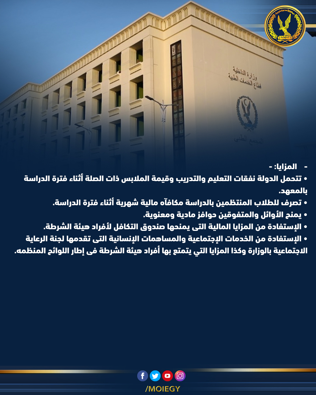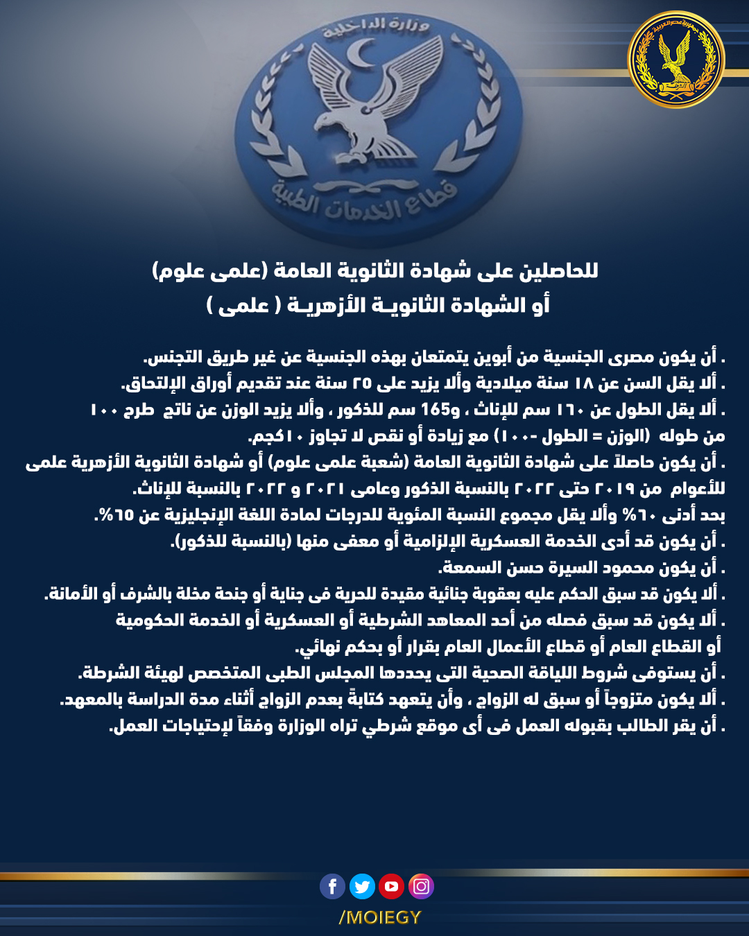وعن شروط شروط التقديم للمعاهد الفنية الصحية الشرطية، ذكرت الوزارة في بيانها أن مدة الدراسة بـ المعاهد الفنية الصحية الشرطية سنتان، ويحصل الخريج على دبلوم المعاهد الفنية الصحية الشرطية ويعين بدرجة معاون أمن ثالث، يترقى بعدها في الدرجات المختلفة.