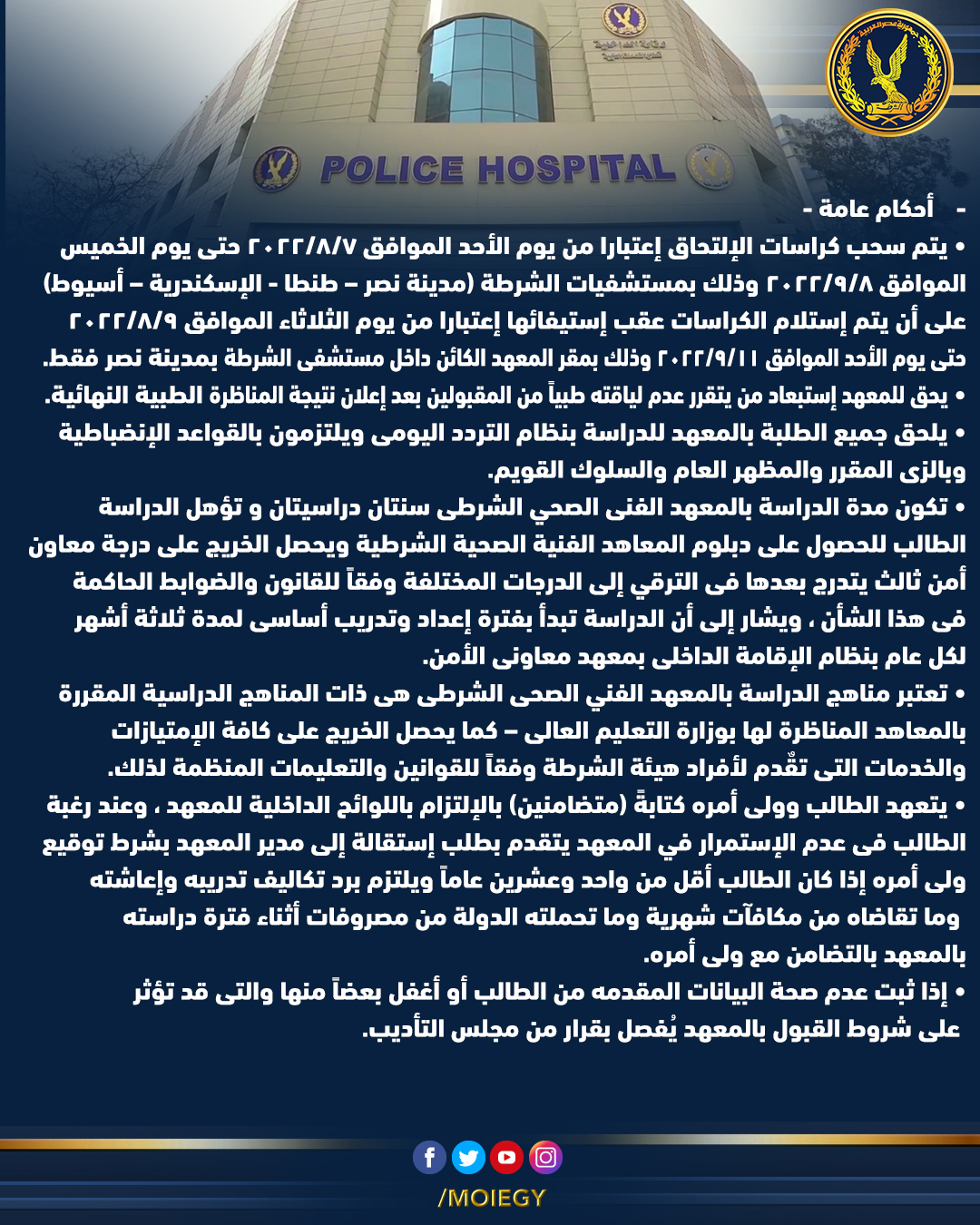 تستقبل مستشفى الشرطة طلبات الراغبين في الالتحاق بالمعاهد الصحية، حيث أعلنت وزارة الداخلية عن فتح باب التقديم للمعاهد الصحية، حيث يتم التقديم للحاصلين على شهادة الثانوية العامة علمي علوم، ويحق للحاصلين على الشهادة الثانوية الأزهرية علمي التقديم، والتقديم يكون لدفعات 2019 حتى 2022، للذكور وعامي 2021 و2022 للإناث وللحاصلين على 60% على ألا يقل نسبة النجاح في اللغة الإنجليزية عن 65%.