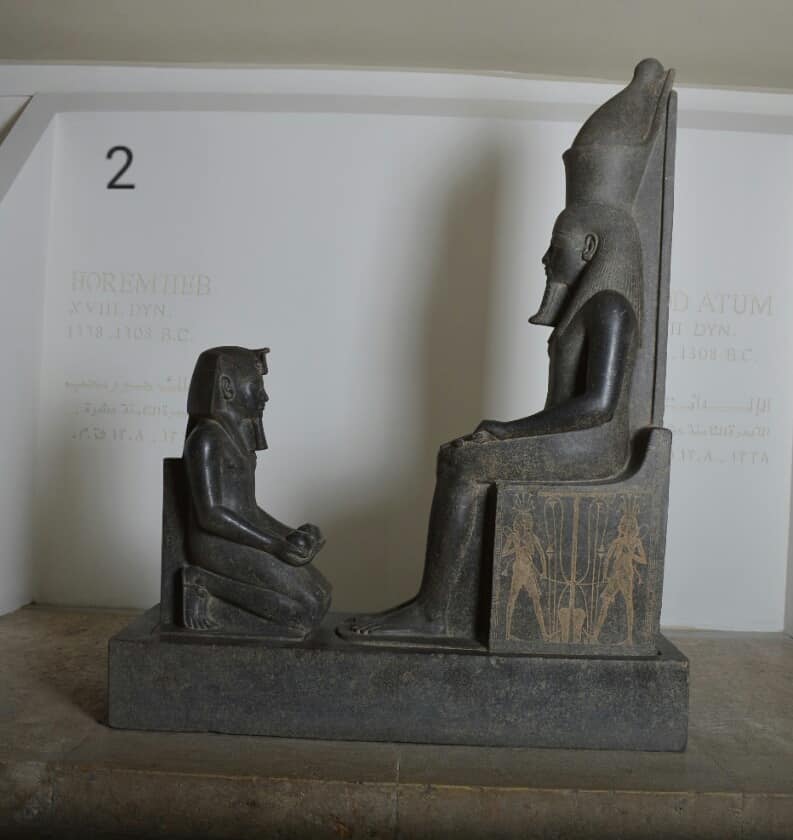 - تمثالان متقابلان تجمعهما قاعدة واحدة بأعلاها تجويفان لوضع التمثالين وهما للإله آتوم والملك حور محب، ويزين جانبي كرسي العرش الذي يجلس عليه الإله المنظر التقليدي لإله النيل حابي وهو رب النيل والفيضان في مصر القديمة.