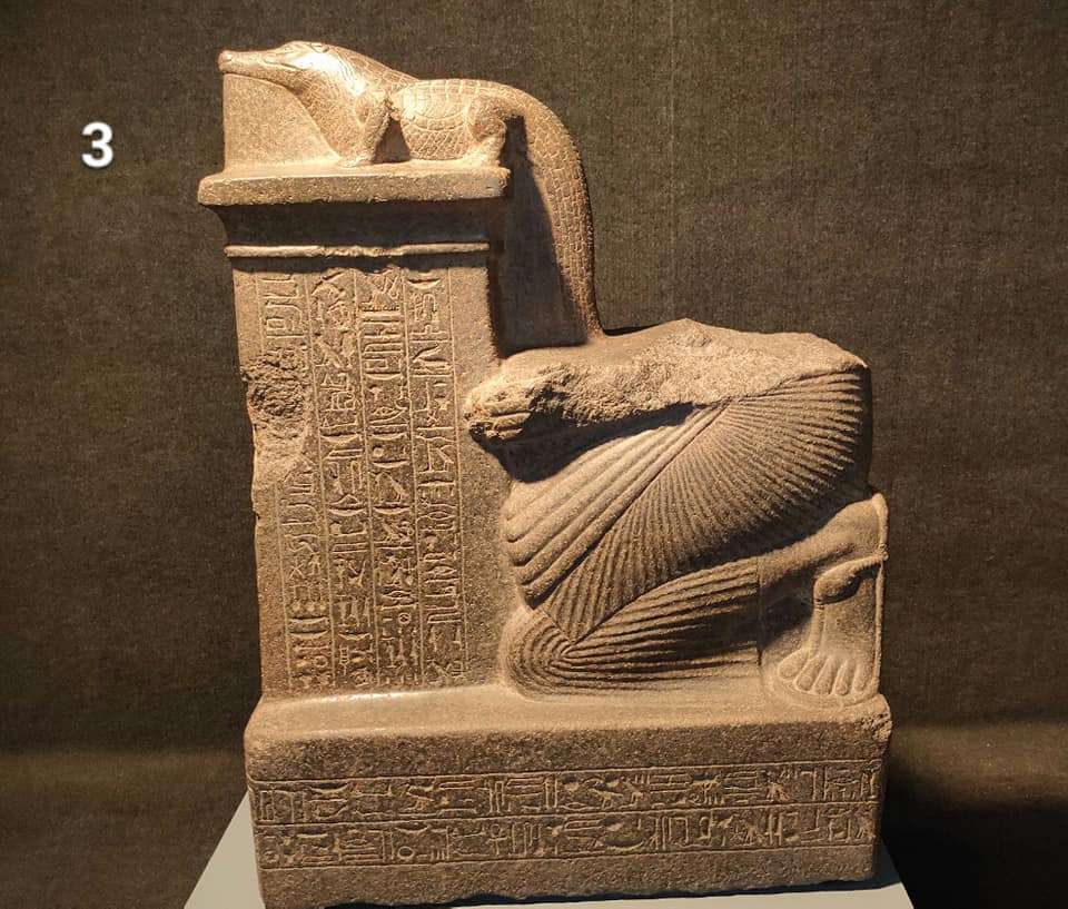 - تمثال مزدوج يمثل الإله سوبك برأس تمساح وجسم آدمي جالسًا، وعلى يساره تمثال للملك أمنحتب الثالث واقفًا.
