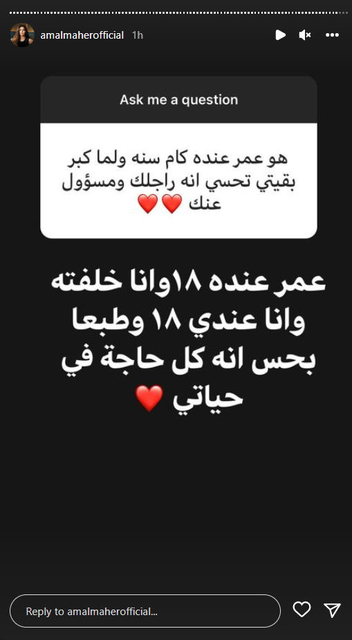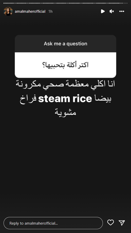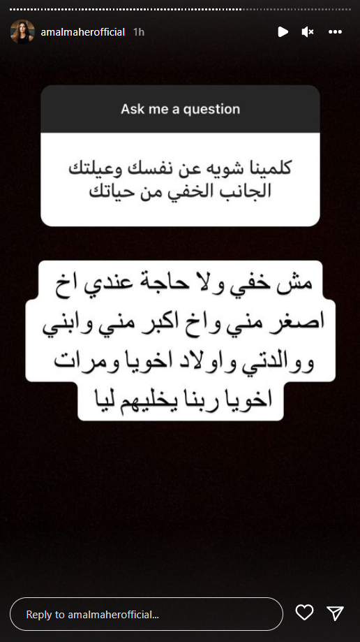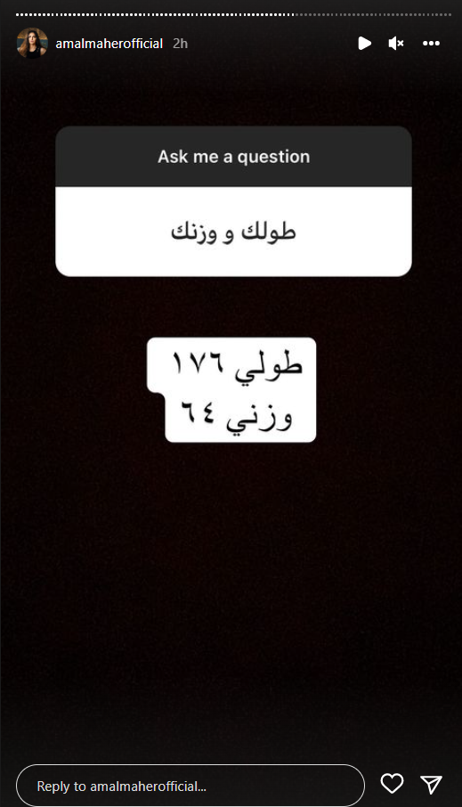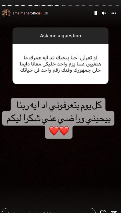 خصصت الفنانة آمال ماهر، جزءًأ من وقتها؛ للرد على أسئلة متابعيها، لأول مرة عبر حسابها بموقع تبادل الصور والفيديوهات انستجرام، بعد النجاح الذي حققته بحفلها الأخير في العلمين، والذي عادت من خلاله لجمهورها بعد فترة غياب طويلة.