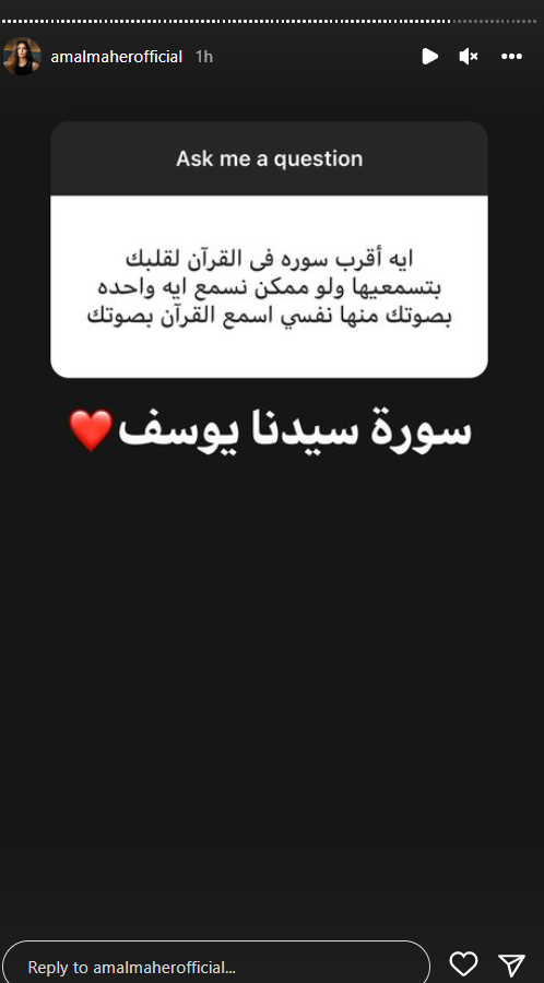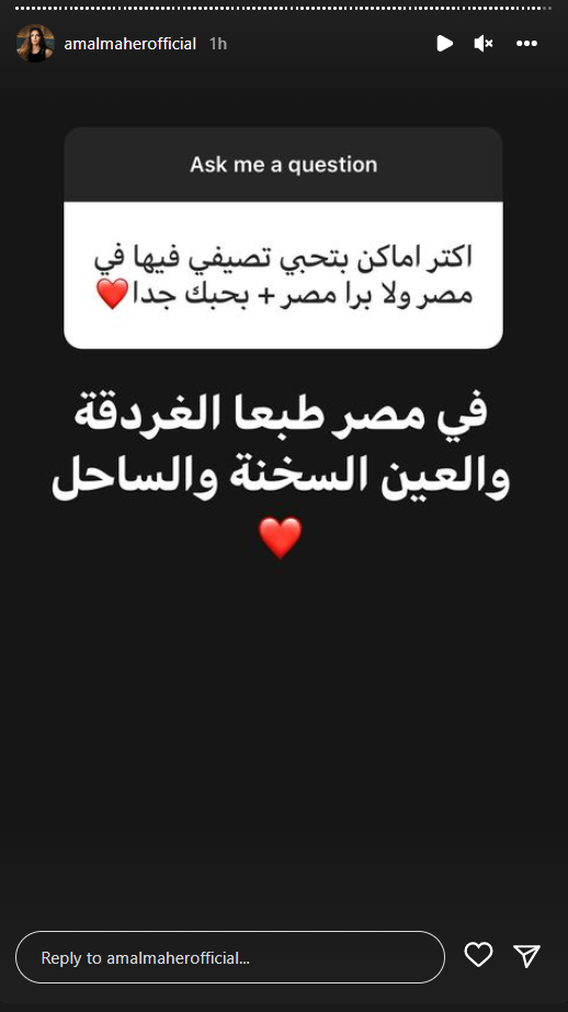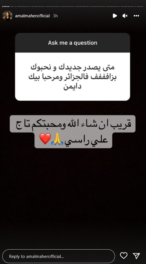 وكشفت آمال ماهر أنها تستعد لتقديم أغاني لجمهورها خلال الفترة المقبلة، خلال ردها على أحد أسئلة متابعيها، وقالت إن أكثر الأماكن التي تحب زيارتها هي الساحل والغردقة والعين السخنة، وأن أكثر سورة مقربة لها هي يوسف.