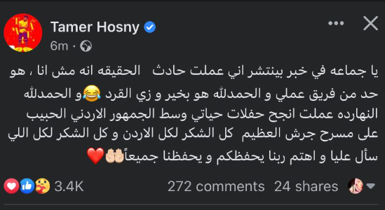 وكتب تامر حسني عبر صفحته الرسمية بموقع فيس بوك: يا جماعة في خبر بينتشر أني عملت حادث.. الحقيقة أنه مش أنا، هو حد من فريق عملي والحمدلله هو بخير وزي القرد.