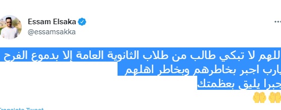 وغرد آخر: طلاب الثانوية العامة أحسنوا استقبال قدر الله واختياره، وكتب مغرد: يا رب نجحهم، مش لأجلهم، لأجل أهاليهم الغلابة اللي طلع عينهم في المصاريف طول السنة.