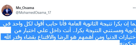 كتب مغرد: ياريت لو حد عنده ابن أو بنت يحتويه بعد ظهور النتيجة، لأن أوقات كتير التوقعات بتخونا وممكن توصل لدرجة الخذلان، تعنيفك وتأنيبك لابنك بعد ظهور النتيجة زيه زى البكاء على اللبن المسكوب، وهيضر الولد مش هينفعه حافظوا على أولادكم وشجعوهم.