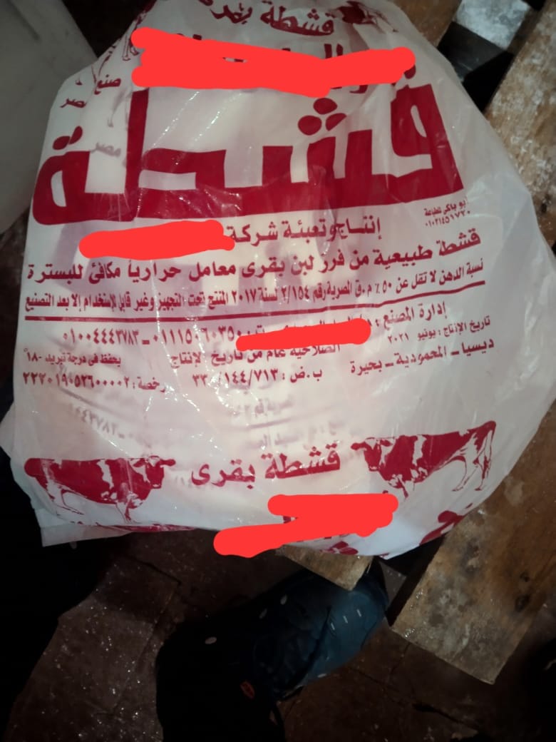 وتم ضبط عدد تسع عبوات قشطة منتج نهائي، مدون على العبوات تاريخ إنتاج يونيو 2021، الصلاحية لمدة عام، أي أنها منتهية الصلاحية، وبإجمالي وزن 135 كيلوجراما، وتم تحرير محضر ضبط بذلك، وقيد برقم 9935 لسنة 2202 جنح مركز شرطة المحمودية، وللعرض على النيابة العامة للتصرف.