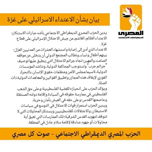 وناشد حزب المصري الديمقراطي الاجتماعي، المؤسسات الدولية، خاصة مجلس الأمن ومنظمات حقوق الإنسان، بالتحرك الفوري لإيقاف هذه المجازر وتطبيق القوانين والمعاهدات الدولية ذات الصلة، مؤكدًا على انحيازه للقضية الفلسطينية، وعلى حق الشعب الفلسطيني في ممارسة حقوقه في السيادة وإقامة دولته المستقلة وعاصمتها القدس، وعلى حقه في العيش بأمان وحرية.