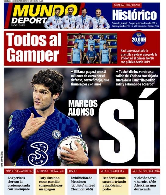 تصدر ماركوس ألونسو لاعب فريق تشيلسي غلاف موندو ديبورتيفو لعدد اليوم، حيث قالت إن ماركوس ألونسو قال نعم لإدارة البلوجرانا، وسوف يدفع برشلونة حوالي 8 ملايين يورو لضمه، كما سيوقع على عقود لمدة موسمين مع خيار التمديد لعام إضافي.
