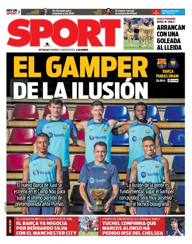 تصدر تشافي هيرنانديز رفقة لاعبي برشلونة غلاف الصحيفة لعدد اليوم، حيث قالت إن كأس خوان جامبر يجلب الأمل للفريق، وأوضحت أن تشافي الجديد سيظهر في برشلونة لأول مرة في كامب نو للعب مباراته الأخيرة في الفترة التحضيرية ضد بوماس المكسيكي.