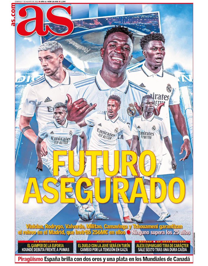 قالت آس في غلافها إن مستقبل ريال مدريد في أمان، حيث أوضحت بأن السداسي فينيسيوس ورودريجو وفالفيردي وميليتاو وكامافينجا وتشواميني هم مستقبل ريال مدريد، ولا يتعدى عمرهم 25 عامًا، وأمامهم الكثير.
