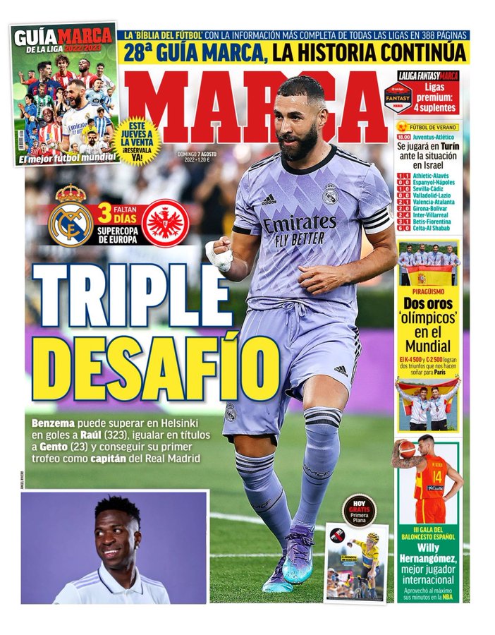 تصدر كريم بنزيما قائد ريال مدريد غلاف صحيفة ماركا لعدد اليوم، حيث عنونت بـ تحدي ثلاثي، وقالت إن بنزيما خلال مباراة فرانكفورت في السوبر الأوروبي، أمامه فرصة لتحطيم رقم راؤول الذي يملك 323 هدفا، ومعادلة خينتو الذي يملك 23 لقبا، والفوز بأول بطولة له كقائد لريال مدريد.