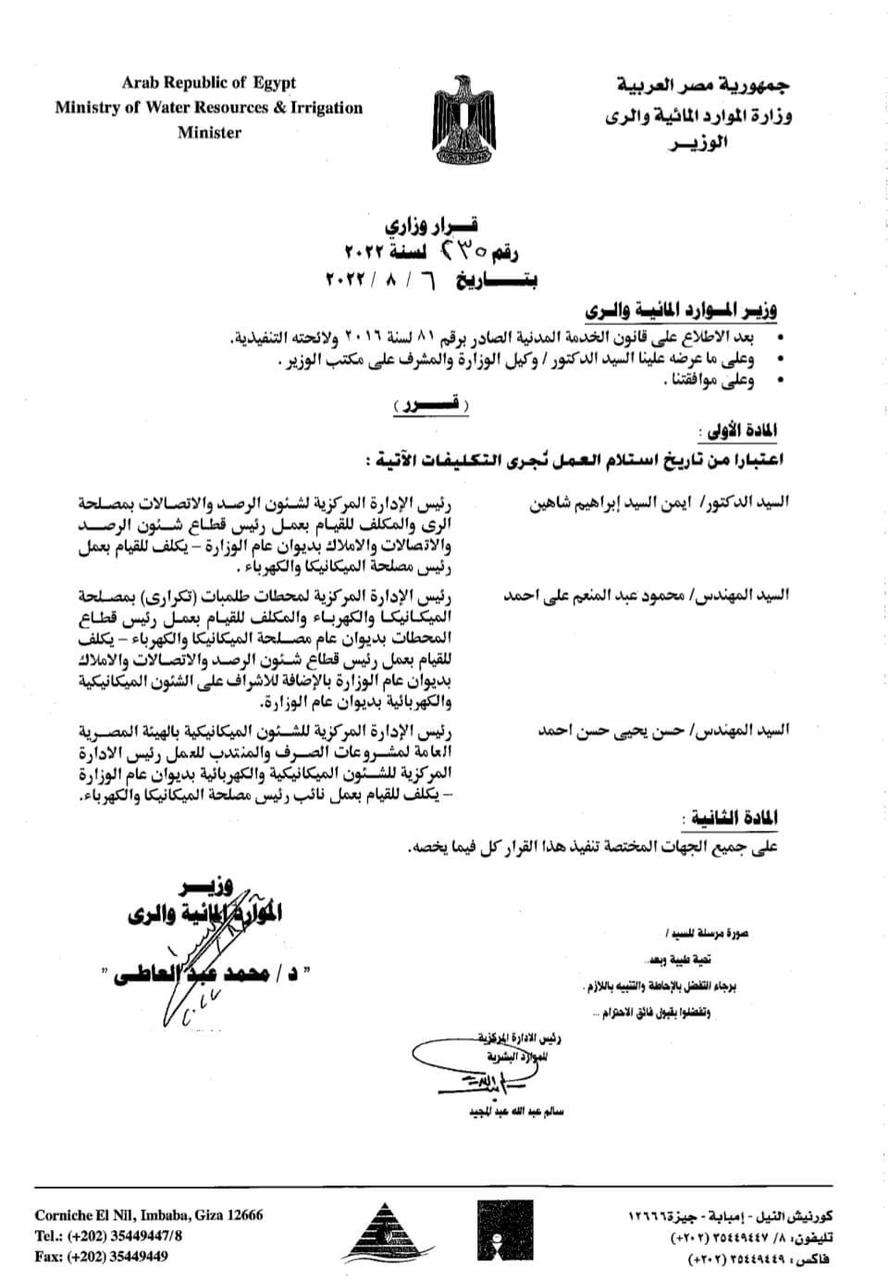 أصدرت وزارة الموارد المائية والري، قرارًا بتكليف الدكتور أيمن السيد إبراهيم، رئيسًا لمصلحة الميكانيكا والكهرباء، خلفًا للمهندس محمد عبد العاطي، رئيس المصلحة الحالي، لبلوغه السن القانونية للمعاش.