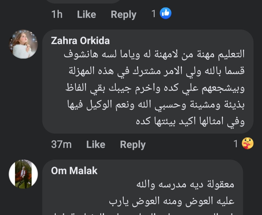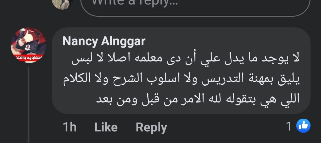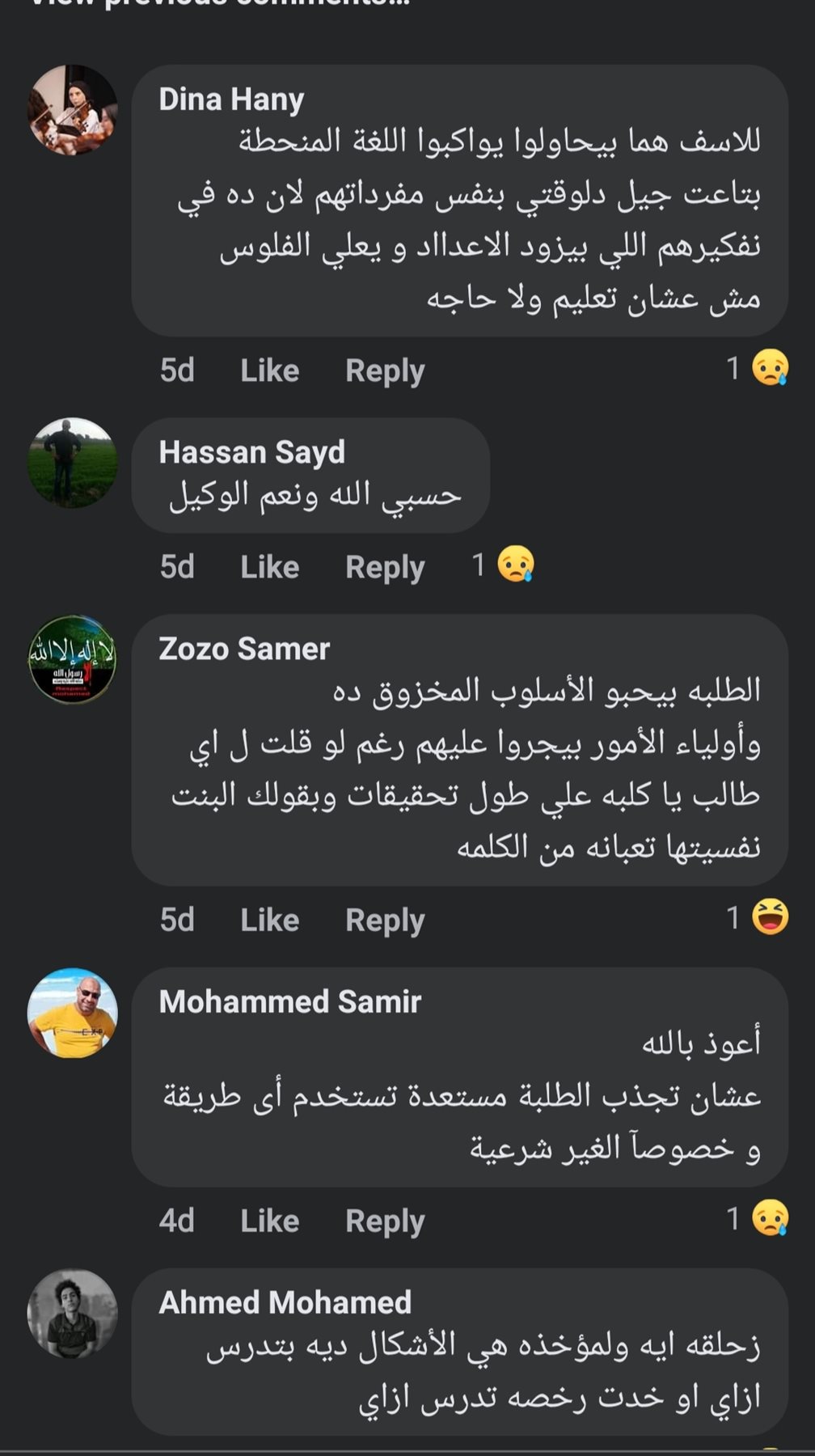 بينما قالت نانسي النجار: لا يوجد ما يدل على إن دي معلمة.. لا لبس يليق بمهنة التدريس ولا أسلوب الشرح ولا الكلام اللي هي بتقوله لله الأمر من قبل ومن بعد، ولفت نبيل فرغل في تعليقه قائلا: أنا هروح أبيع الموبايل.. فين أيام المعادي الثانوية العسكرية والمدرسين العظام.