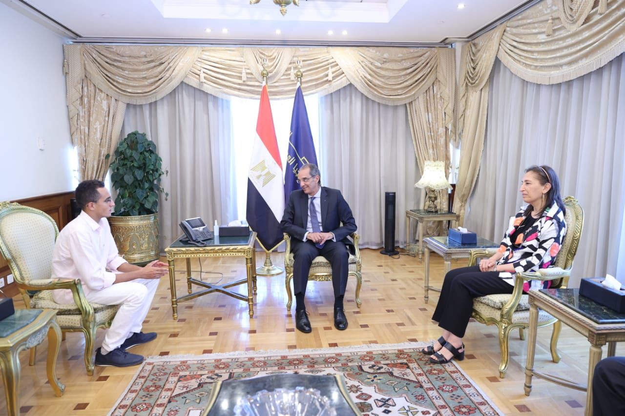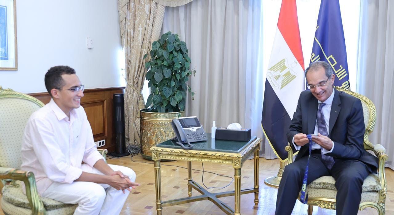 وزير الاتصالات يكرم الطالب محمد الجندي بجامعة مصر للمعلوماتية لفوزه بفضية العالم للخماسي الحديث