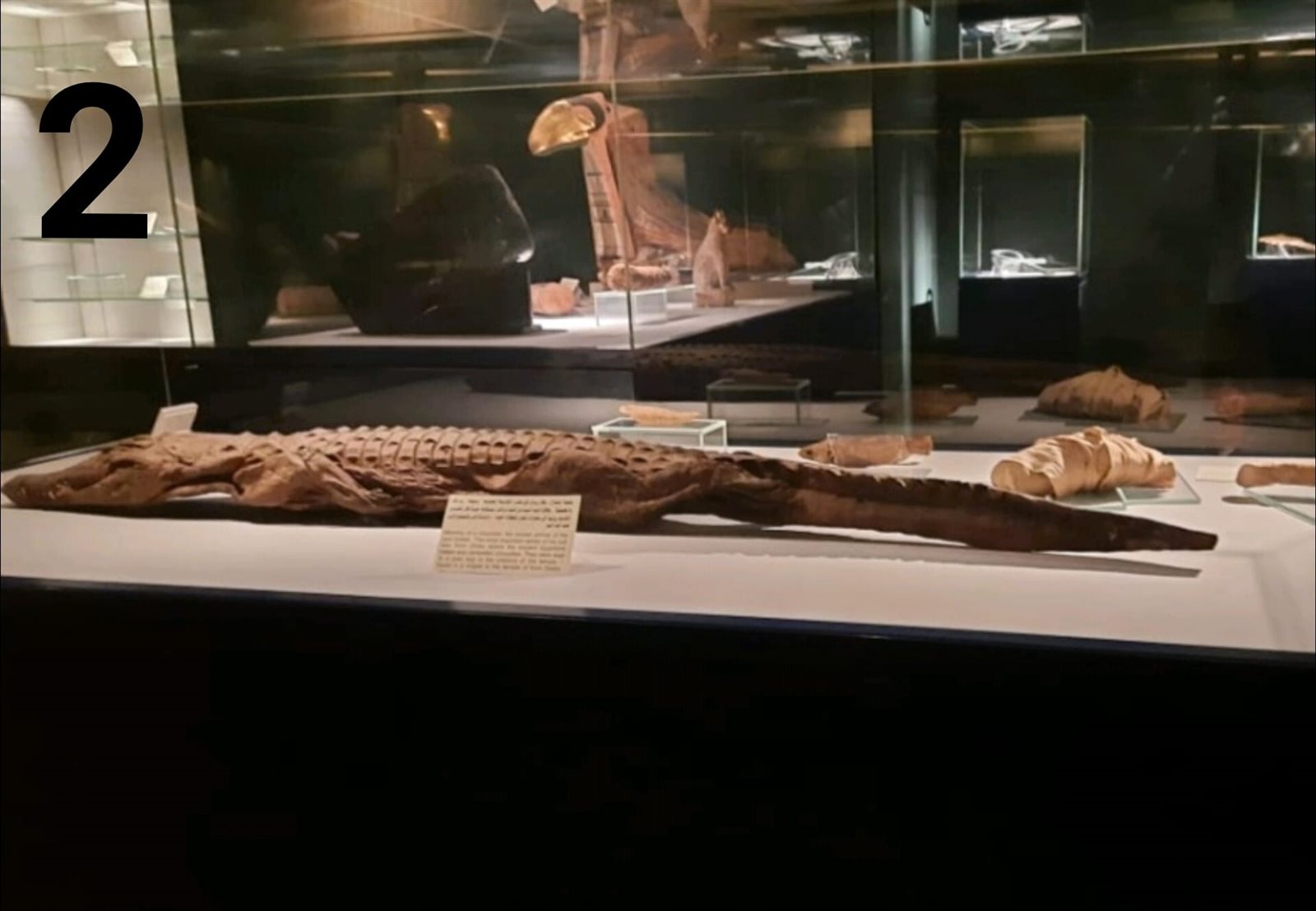 - مومياء تمساح، وكان يرمز التمساح في مصر القديمة للمعبود سوبك رب الماء والخصوبة، وكانت كوم أمبو من اهم مراكز عبادته حيث كان المصري القديم يربيه في بحيرات ضمن ملحقات المعبد وجد في مقصورة في معبد كوم أمبو