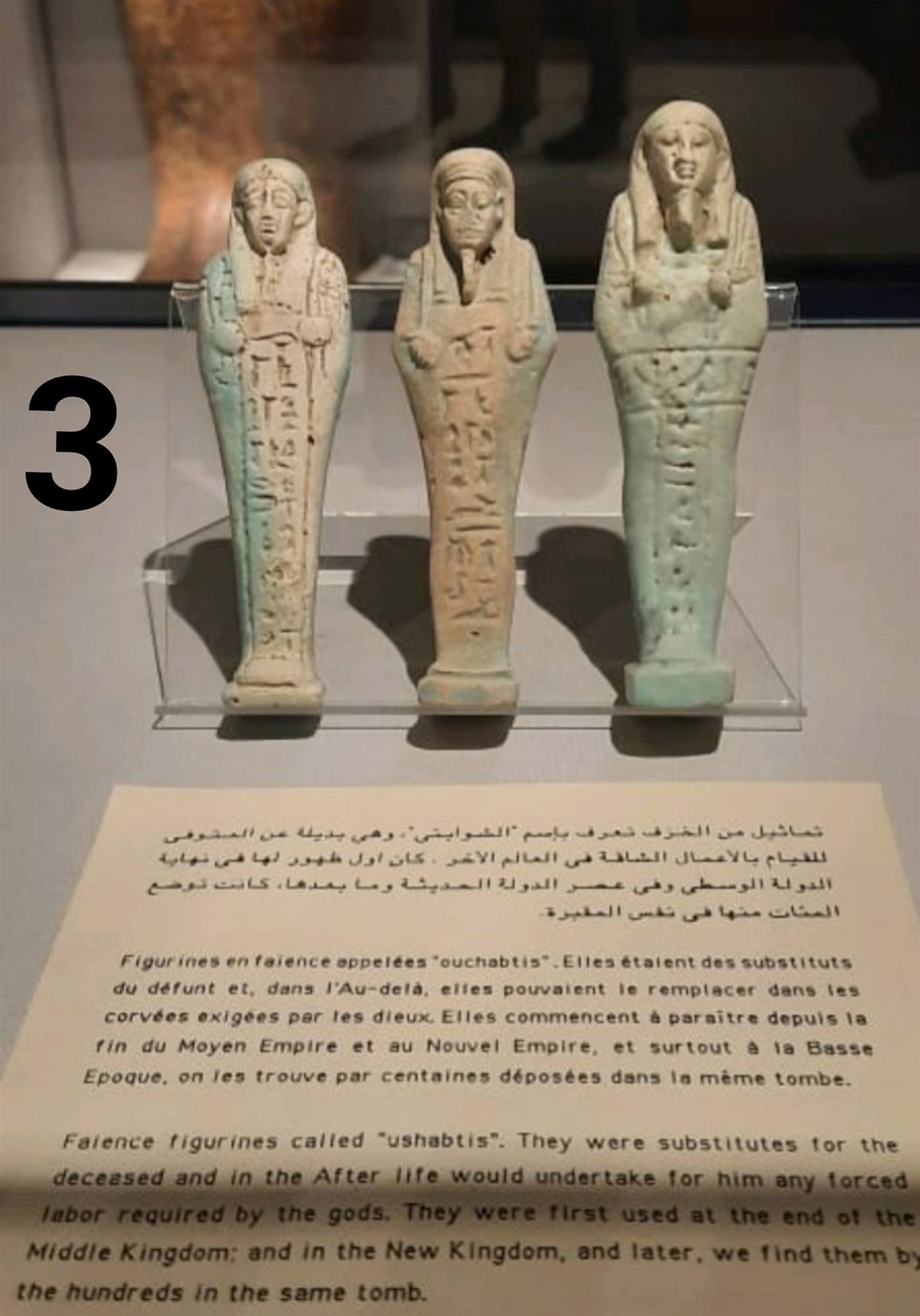 - تماثيل الشوابتي، وهي مجموعة من التماثيل الصغيرة التي علي هيئة اوزوريس مرتديًا الرداء الملكي، وكلمة شوابتي باللغة المصرية القديمة تعني المجيبين والهدف من وجود هذه التماثيل هو خدمة المتوفي في العالم الاخر وأداء الأعمال الشاقة بدلا منه كالزراعة والري والحصاد هذه التماثيل منقوش عليها كتابات من كتاب الموتى.